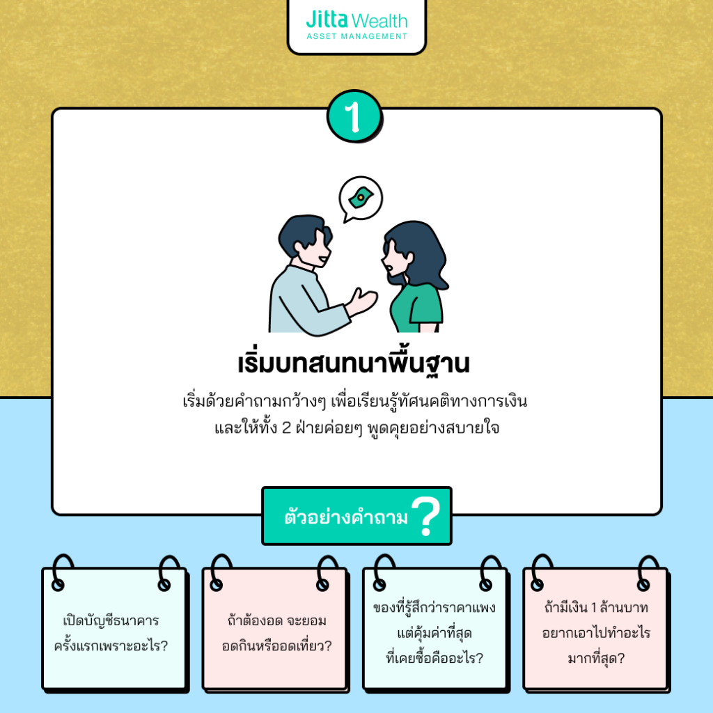 บทสนทนาในช่วงแรก อาจเริ่มต้นด้วยคำถามกว้างๆ ก่อน เช่น ครอบครัวคุณมีวิธีจัดการเรื่องการเงินอย่างไร แล้วคุณมีความคิดเห็นอย่างไร เป้าหมายทางการเงินของคุณคืออะไร ในแต่ละเดือนคุณมีภาระค่าใช้จ่ายอะไรบ้าง