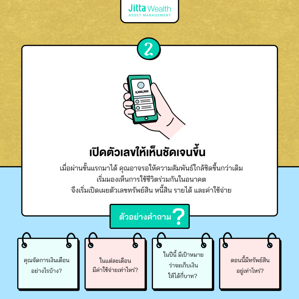 - คุณไม่จำเป็นต้องพูดคุยทุกขั้นตอนรวดเดียว จะคุยลึกแค่ไหนอยู่ที่ความสะดวกใจของแต่ละคู่ แต่อยากให้เปิดใจว่าเรื่องนี้คุยกันได้ โดยอาจเริ่มจากคำถามกว้างๆ ก่อนเพื่อเรียนรู้ทัศนคติทางการเงินของกันและกัน และค่อยๆ ขยับมาเป็นการเปิดตัวเลขให้เห็นได้ชัดๆ