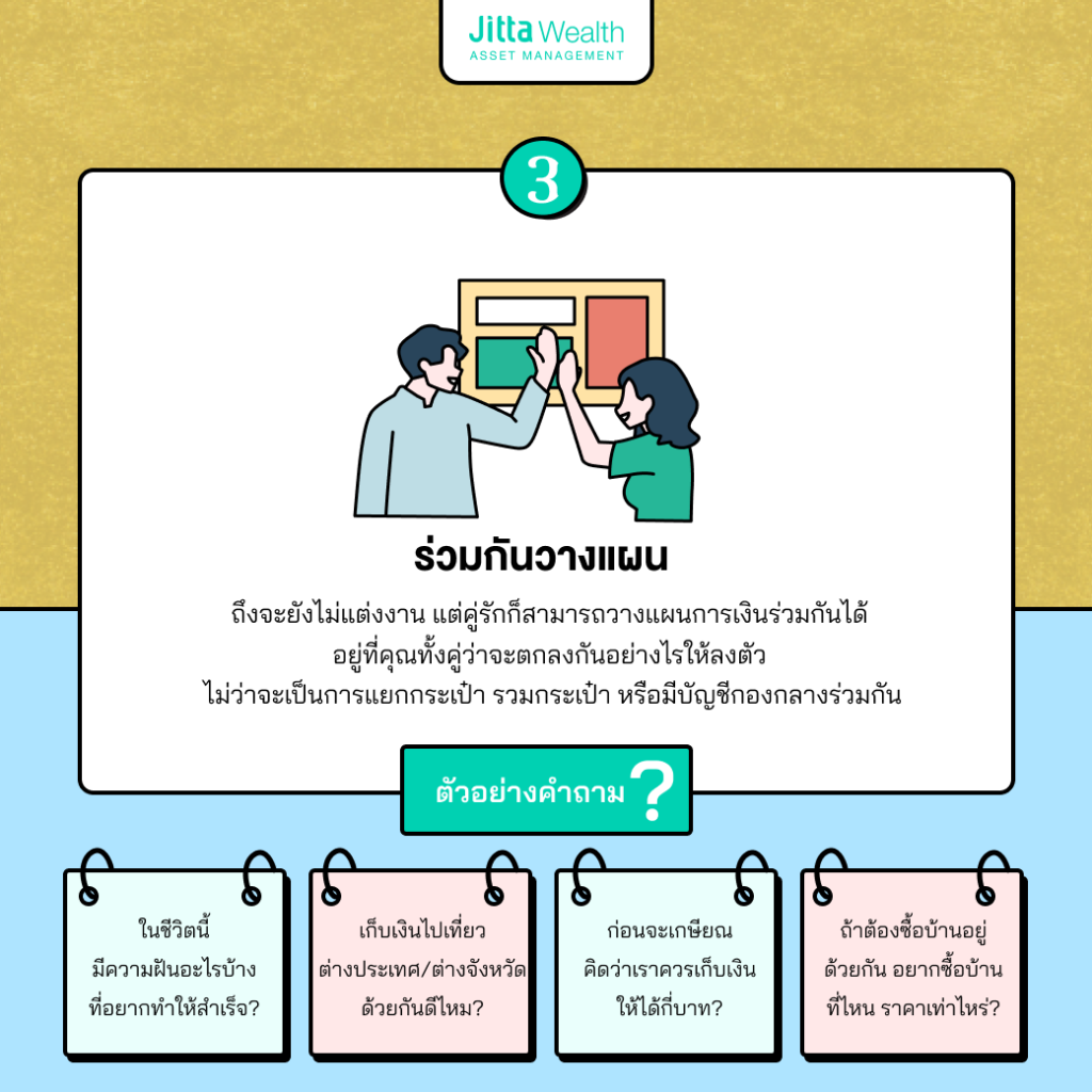 - เมื่อความสัมพันธ์เริ่มเห็นเป้าหมายในอนาคตชัดเจนขึ้น คุณก็สามารถจัดลำดับความสำคัญและวางแผนการเงินด้วยกันได้ เพื่อให้บรรลุเป้าหมายที่มีร่วมกัน