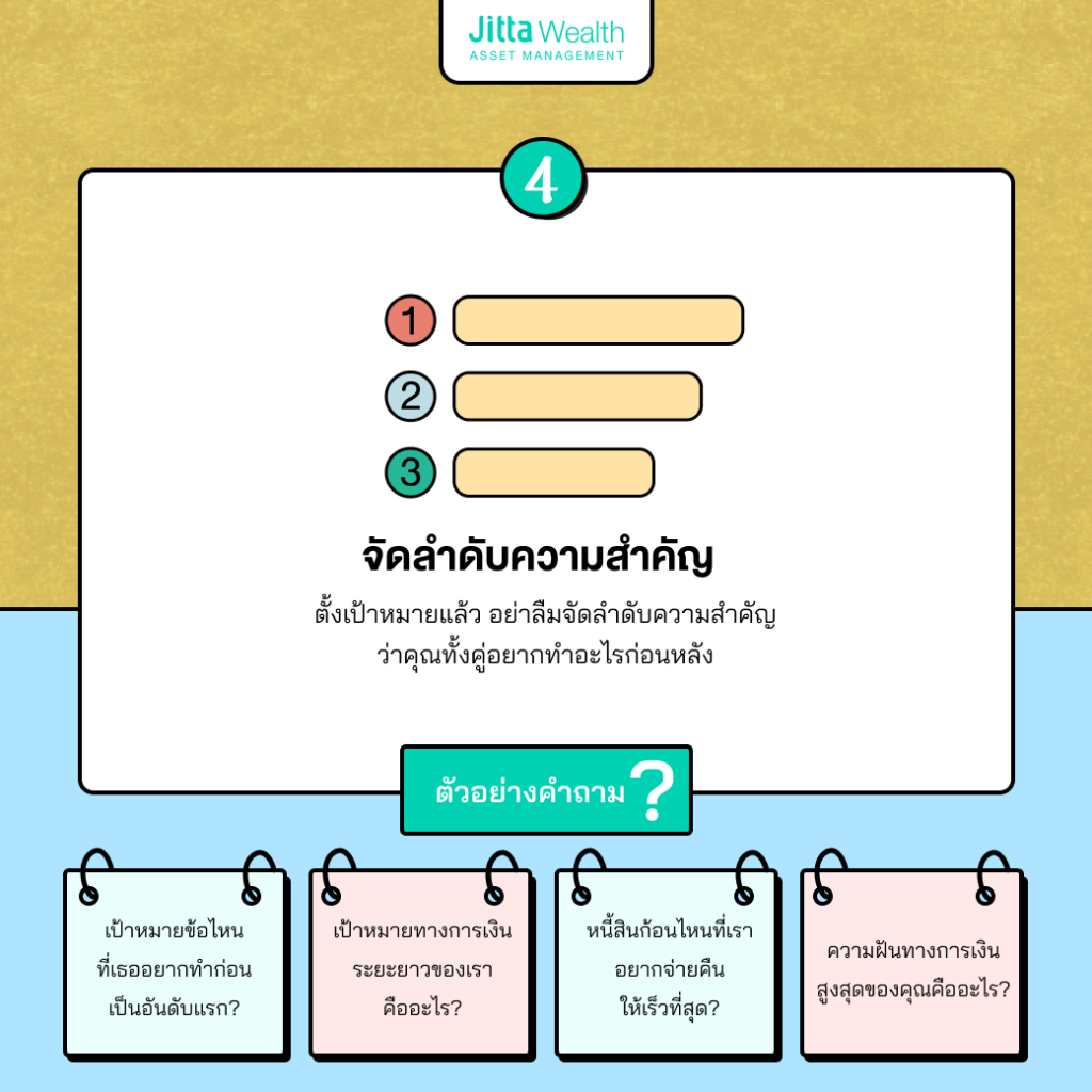 คุณทั้งคู่สามารถพูดคุยกันต่อไปได้ว่า แล้วเป้าหมายเหล่านั้นมีรายละเอียดอย่างไรบ้าง เป้าหมายใดเป็นเป้าหมายระยะสั้น เช่น ทริปท่องเที่ยวต่างประเทศในปีนี้ หรือการต่อเติมหรือซ่อมแซมบ้าน