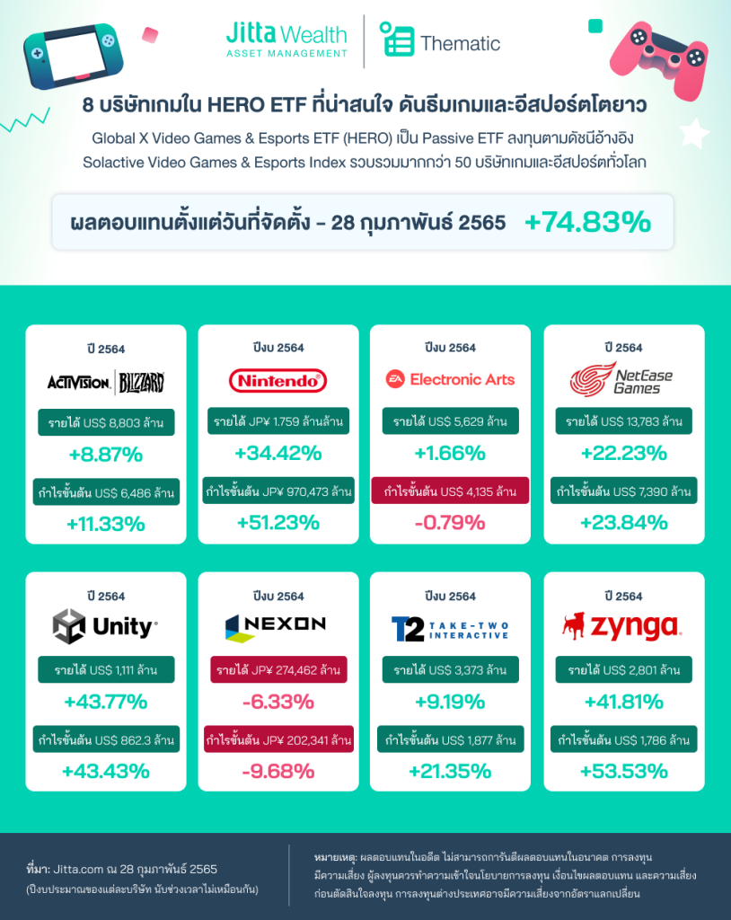 - 8 ‘บริษัทเกม’ มีสัดส่วนรวมกันใน HERO ETF เกือบ 50% ได้แก่ บริษัท Activision Blizzard บริษัท Nintendo บริษัท Electronic Arts บริษัท NetEase บริษัท Nexon บริษัท Take-Two Interactive Software และบริษัท Zynga