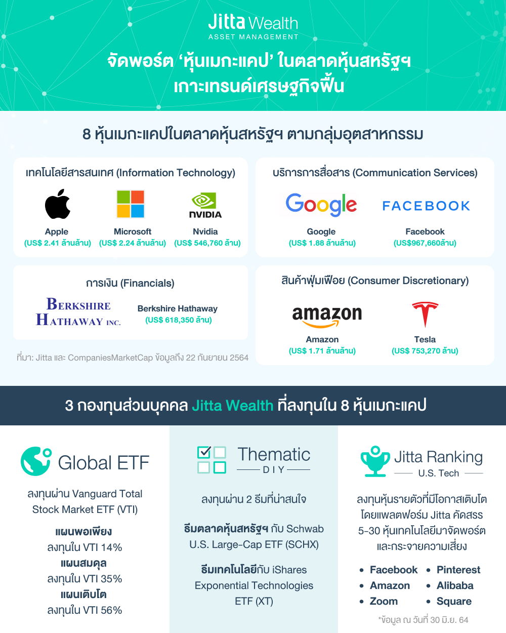 หากคุณสนใจลงทุน 8 ‘หุ้นเมกะแคป’ เหล่านี้ อยากจะลงทุนระยะยาวในหุ้นคุณภาพ ช่วงที่เศรษฐกิจสหรัฐฯ กำลังฟื้นตัวได้ดี เพื่อรับเทรนด์ตลาดหุ้นขาขึ้นหลังวิกฤต Covid-19 นโยบายลงทุนจาก Jitta Wealth ทั้ง 3 น่าจะตอบโจทย์คุณได้เป็นอย่างดี ลองศึกษาข้อมูลเพิ่มเติมได้ที่
