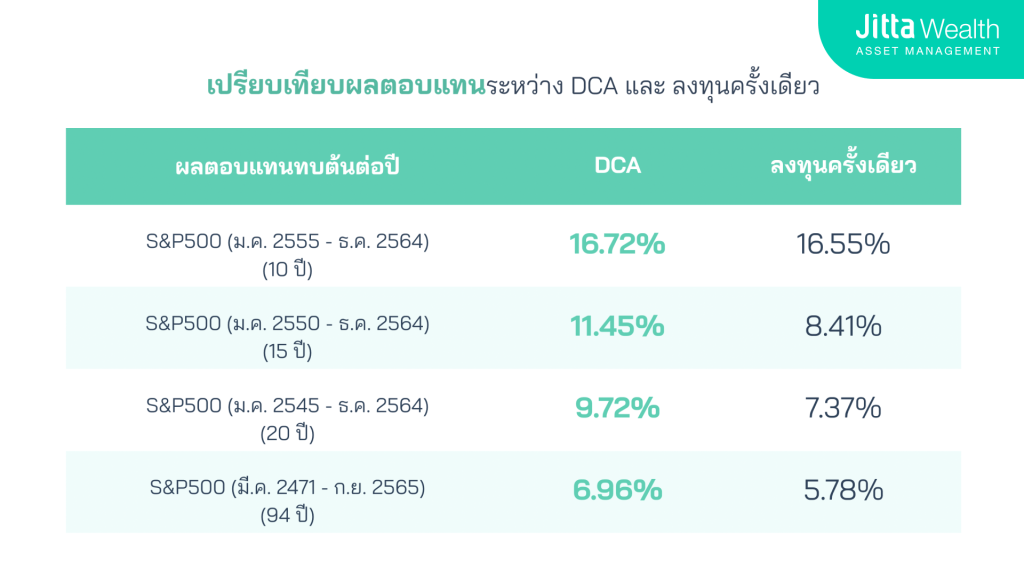 คุณเผ่า: การ DCA จะมีช่วงเวลาของมันตอนตลาดหุ้นขึ้นหรือลง ถ้าเราดูผลตอบเทนเปรียบเทียบกับการลงทุนครั้งเดียวในช่วงเวลาที่สั้นเกินไป บางทีการลงทุนแบบ DCA อาจจะแพ้การลงทุนครั้งเดียวก็ได้ถ้าจับจังหวะได้ดีมากๆ แต่การ DCA ในระยะยาวจะให้ผลตอบแทนที่ดีกว่าการลงทุนครั้งเดียวอยู่บ่อยครั้ง