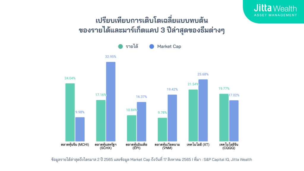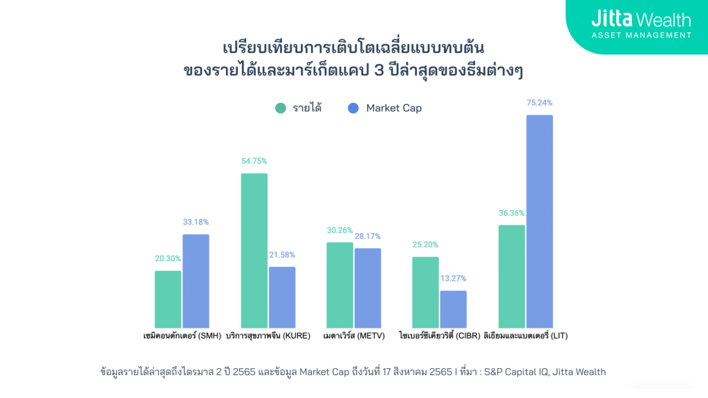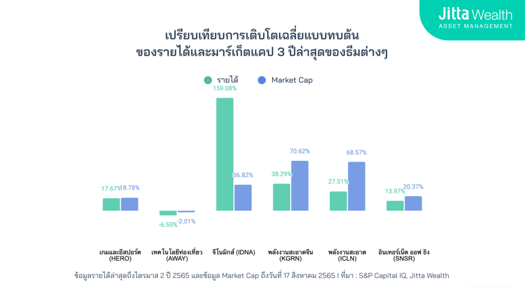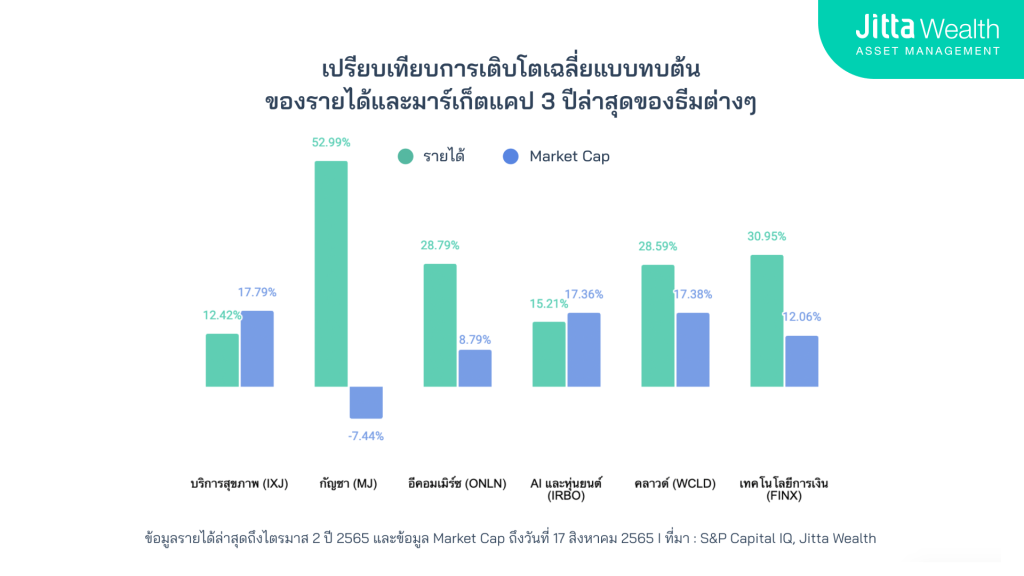คำแนะนำ การเลือกธีมลงทุนในแผน Thematic DIY ให้คุณลองเลือกธีมที่มีรายได้เติบโตกว่ามูลค่ามาร์เก็ตแคปของ ETF ในช่วง 3 ปีล่าสุด ซึ่งแสดงว่าธุรกิจที่อยู่ใน ETF มีผลประกอบการเติบโตมากกว่าราคาหน่วยลงทุนและมีโอกาสทำผลตอบแทนได้ดี หลายธีมที่ Jitta Wealth คัดสรรมาให้ โดยส่วนใหญ่รายได้จะเติบโตมากกว่ามูลค่ามาร์เก็ตแคปอยู่หลายธีม