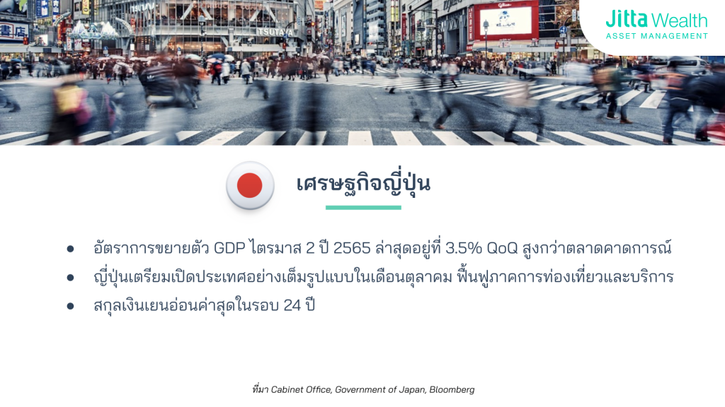 ญี่ปุ่น ใกล้จะเปิดประเทศโดยไม่มีเงื่อนไขในเดือนตุลาคม 2565 นี้ ซึ่งจะส่งผลดีต่อเศรษฐกิจญี่ปุ่นอย่างแน่นอน นอกจากนี้ ถ้าดูที่ตัวเลข GDP ของญี่ปุ่นจะเห็นว่าในไตรมาสที่ 2 ปี 2565 เติบโตถึง 3.5% QoQ สูงกว่าที่นักวิเคราะห์คาดการณ์ที่ 2.6% ไปไกล และเป็นอัตราการเติบโตที่น่าประทับใจสำหรับประเทศที่มีขนาดเศรษฐกิจใหญ่อย่างญี่ปุ่น
