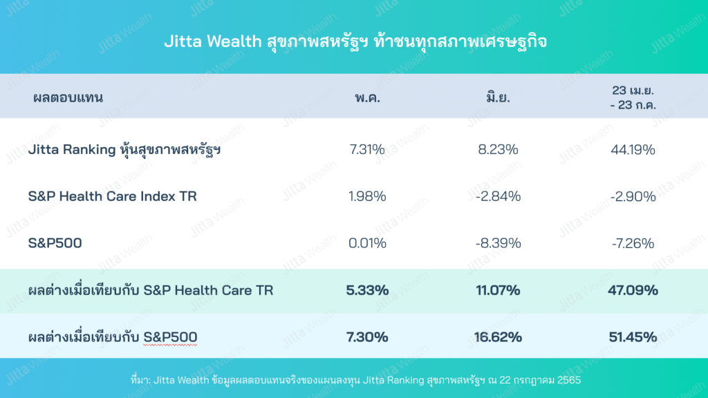 แผนลงทุน Jitta Ranking หุ้นสุขภาพสหรัฐฯ สร้างผลตอบแทนได้สูงถึง 44.19% ในระยะเวลาเพียงแค่ 3 เดือนเท่านั้น (23 เม.ย. – 23 ก.ค. 2565) อย่างที่ได้เคยแนะนำไปว่าหุ้นประเภท Defensive ทนทานต่อเงินเฟ้อได้สูง มีแนวโน้มการเติบโตที่ดีในปี 2565 และเป็นหุ้นที่น่าลงทุน