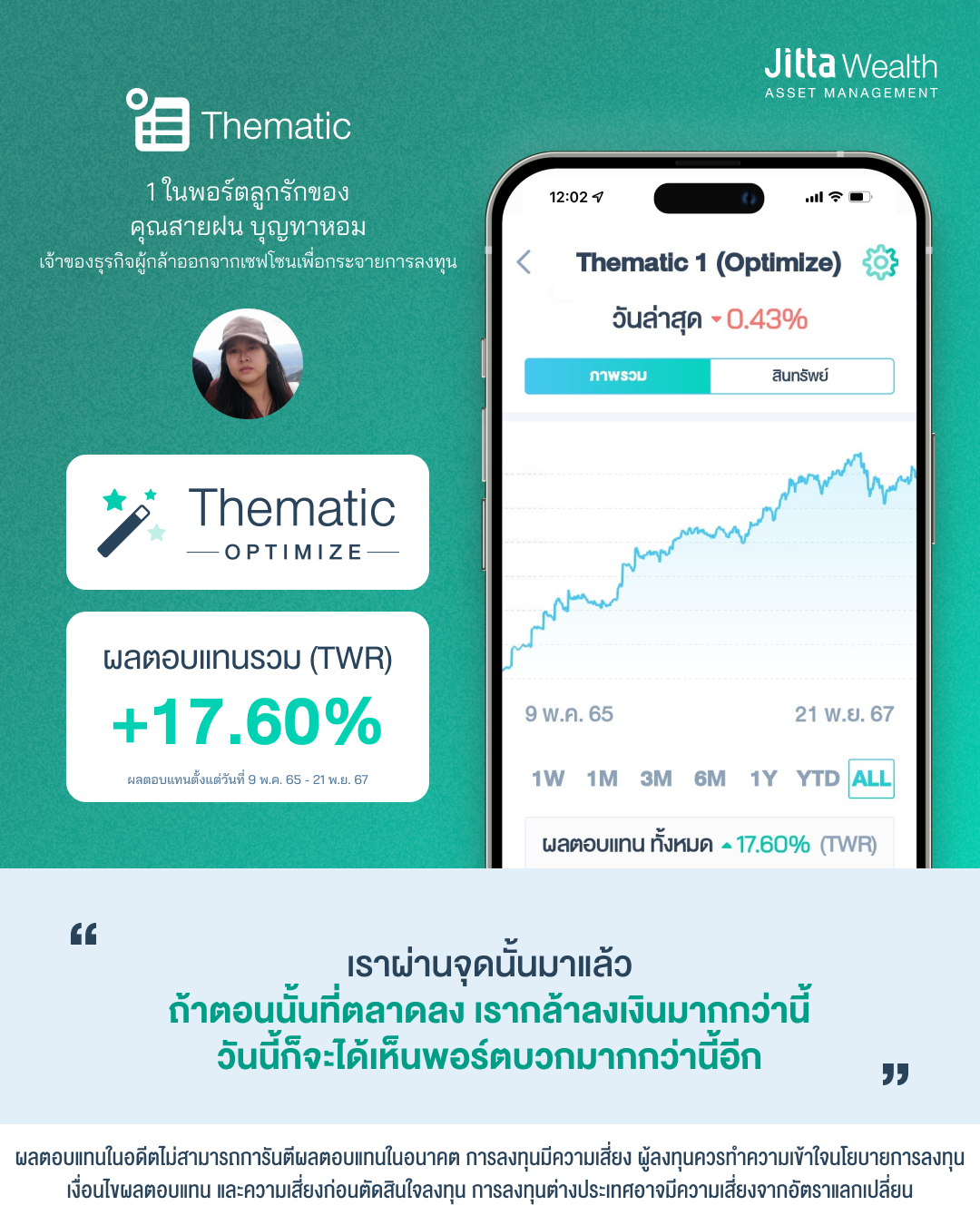 คำตอบที่ได้คือ การได้สัมผัสคำว่า “เงินเฟ้อ” อย่างชัดเจนด้วยตัวเอง และนั่นทำให้เธอกล้าเริ่มต้นเปิดรับความเสี่ยงจากการลงทุนในกองทุน และที่สำคัญคือเป็นการออกไปลงทุนในต่างประเทศกับ Jitta Wealth โดยเธอได้ลงทุนใน Thematic Optimize ที่สร้างผลตอบแทนให้เธอได้ถึง +17.60% (ตั้งแต่ 9 พ.ค. 2565-21 พ.ย. 2567)