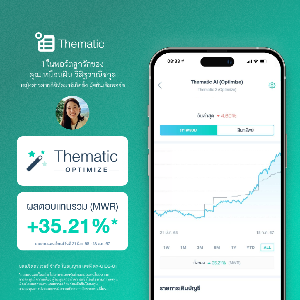 “จุดเริ่มต้นการลงทุนเพราะเป็นคนชอบเสี่ยง ที่เลือก Thematic Optimize ของ Jitta Wealth เพราะไม่ต้องเลือกธีมเอง มี AI เลือกให้ เพราะรู้ว่าถ้าตัดสินใจเอง มักจะตัดสินใจผิด ”