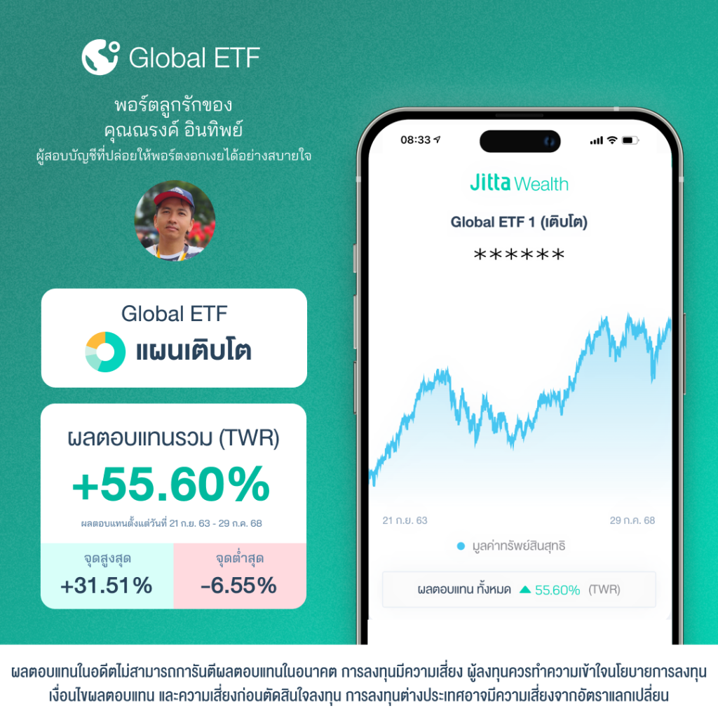“ผมลงทุน Jitta Wealth แล้วได้ความสบายใจ ไม่ทำให้ผิดหวัง ตอนหุ้นลงก็ไม่ได้ลงเหมือนพอร์ตที่ลงทุนเองหรือลงทุนกับที่อื่นที่ติดลบหนักกว่านี้” Global ETF +55.60% (21 ก.ย. 63 – 29 ก.ค. 68)