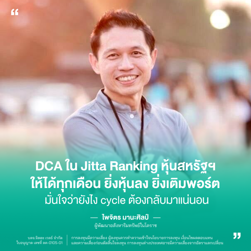 มีลูกค้า Jitta Wealth จำนวนไม่น้อยที่เชื่อในหลักการ DCA แต่ก็ใช่ว่าทุกคนจะเลือกใช้กลยุทธ์การ DCA ได้อย่างสม่ำเสมอด้วยเงื่อนไขต่างๆ ในการลงทุน แต่หนึ่งในลูกค้าที่ขยันเติมพอร์ตตั้งแต่ Jitta Wealth ยังไม่มีบริการตัดบัญชีเงินฝากอัตโนมัติ จนเป็นหนึ่งในลูกค้าที่มีการ DCA ใน Jitta Ranking หุ้นสหรัฐฯ และ Jitta Ranking หุ้นไทยบ่อยที่สุด ต้องยกให้คุณไพจิตร มานะศิลป์ ผู้พัฒนาอสังหาริมทรัพย์ในโคราช ที่เชื่อมั่นในหลักการ DCA และตั้งเป้าเติมเงินเข้าพอร์ตให้ได้ทุกเดือน