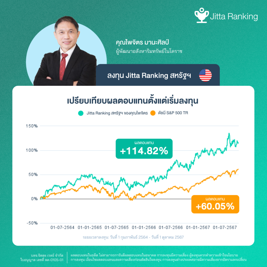 ปัจจุบัน Jitta Ranking หุ้นสหรัฐฯ ของคุณไพจิตร สร้างผลตอบแทนได้ถึง +114.82% เอาชนะ S&P500 TR ในช่วงเวลาเดียวกัน ที่ทำได้ +60.05% (1 ก.พ. 64-1 ต.ค. 67)
