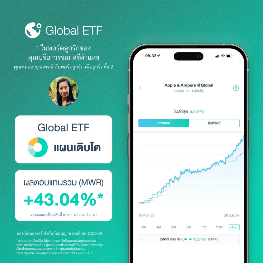 ลูกคือแรงขับเคลื่อนชีวิตคุณพ่อคุณแม่ทุกคน เช่นเดียวกับคุณปรียาวรรณ ศรีคำแหง คุณหมออายุรแพทย์ แม่ของลูกสาว 2 คน ที่ปรับเป้าหมายทางการเงินของตัวเองมาเพื่อลูก โดยเปิด Global ETF แผนเติบโต ด้วยกลยุทธ์การ DCA อย่างต่อเนื่อง จนล่าสุดผลตอบแทนสวยงามที่ +46.22% (TWR) เทียบกับ Morningstar Global ที่ +27.15% ตั้งแต่ วันที่ 18 พ.ย. 2563 – 11 ก.ค. 2567