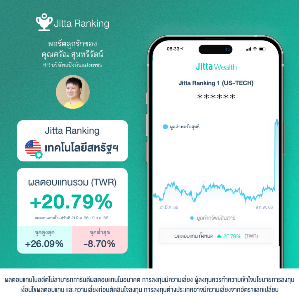 หลายครั้งที่ความประทับใจในการลงทุนกับ Jitta Wealth ที่ทั้งง่ายและสะดวกถูกส่งต่อกันแบบปากต่อปาก ทั้งในหมู่เพื่อนฝูงหรือครอบครัวเช่นเดียวกับคุณศรัณ สุนทรีรัตน์ HR จากบริษัทแป้งมันแสงเพชรที่ไม่เคยมีประสบการณ์ลงทุนมาก่อน แต่ได้รับคำแนะนำจากพี่ชายให้มาทดลองลงทุนกับ Jitta Wealth เกือบ 2 ปีเต็ม พอร์ต Jitta Ranking หุ้นเทคโนโลยีสหรัฐฯ ของเขาก็สามารถสร้างประสบการณ์การลงทุนที่ดีให้ด้วยผลตอบแทนล่าสุด +20.79% (วันที่ 21 มี.ค.66-9 ก.พ.68)