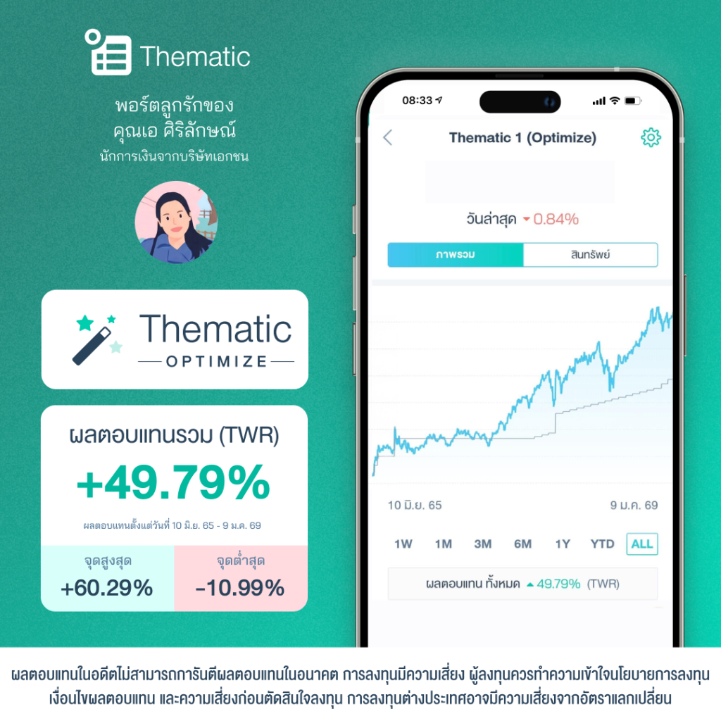“ไม่จำเป็นต้องลงทุนตามกระแส แค่เลือกในสิ่งที่เราพอเข้าใจ และกระจายความเสี่ยง ก็ช่วยให้การลงทุนไปต่อได้อย่างอุ่นใจในระยะยาว” Thematic Optimize +49.79% (10 มิ.ย. 65 – 9 ม.ค. 69)