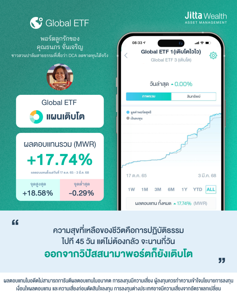 การบริหารชีวิตในวัยเกษียณให้ยังคงสดใสเหมือนดอกไม้บานได้ นอกจากการดูแลจิตใจแล้ว เงินในกระเป๋าก็ต้องเติบโตแบ่งบานเช่นกัน คุณธนภร จั่นเจริญ อดีตพนักงานประจำที่ผันตัวเองมาเป็นเกษตรกรในบั้นปลายชีวิต ถือเป็นหนึ่งในดอกไม้ที่ไม่ได้รอวันเหี่ยวเฉา แม้จะเข้าสู่วัยเกษียณ แต่ก็ยังดูแลจิตใจไปพร้อมกับการลงทุนอย่างมีความสุขได้ ด้วยพอร์ต Global ETF ที่สร้างผลตอบแทน +17.74%. (17 ต.ค. 2565-3 มี.ค. 2568)