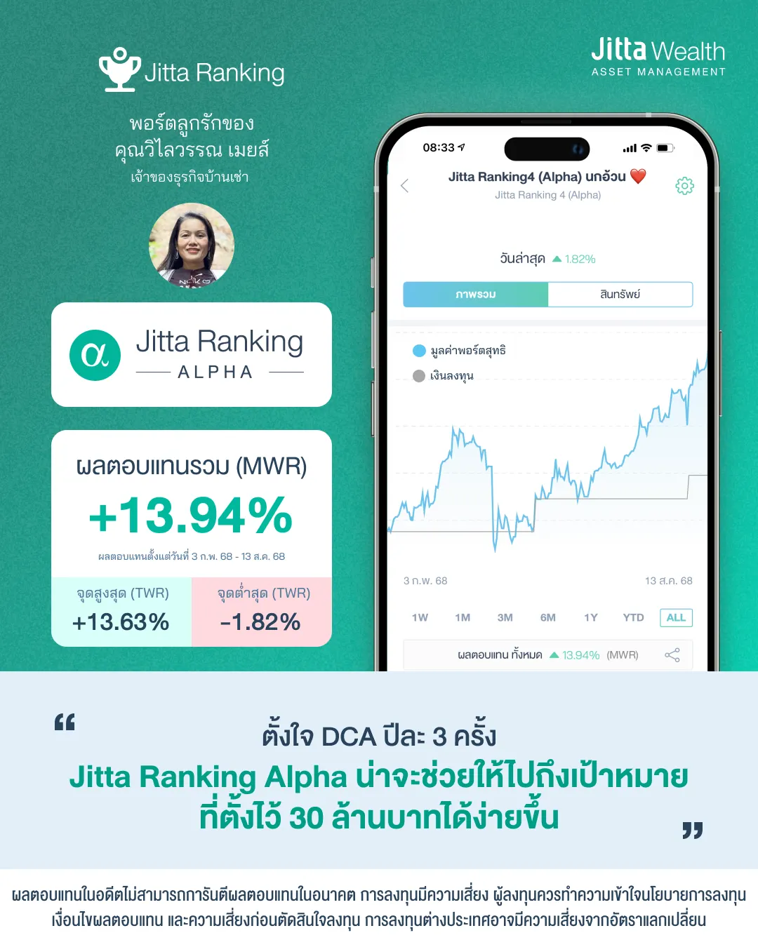 เจ้าของธุรกิจบ้านเช่าที่ DCA ด้วยเงิน 50,000 สู่เป้าหมาย 30 ล้าน กับ Jitta Ranking Alpha +13.94% (3 ก.พ. 68-13 ส.ค. 68)